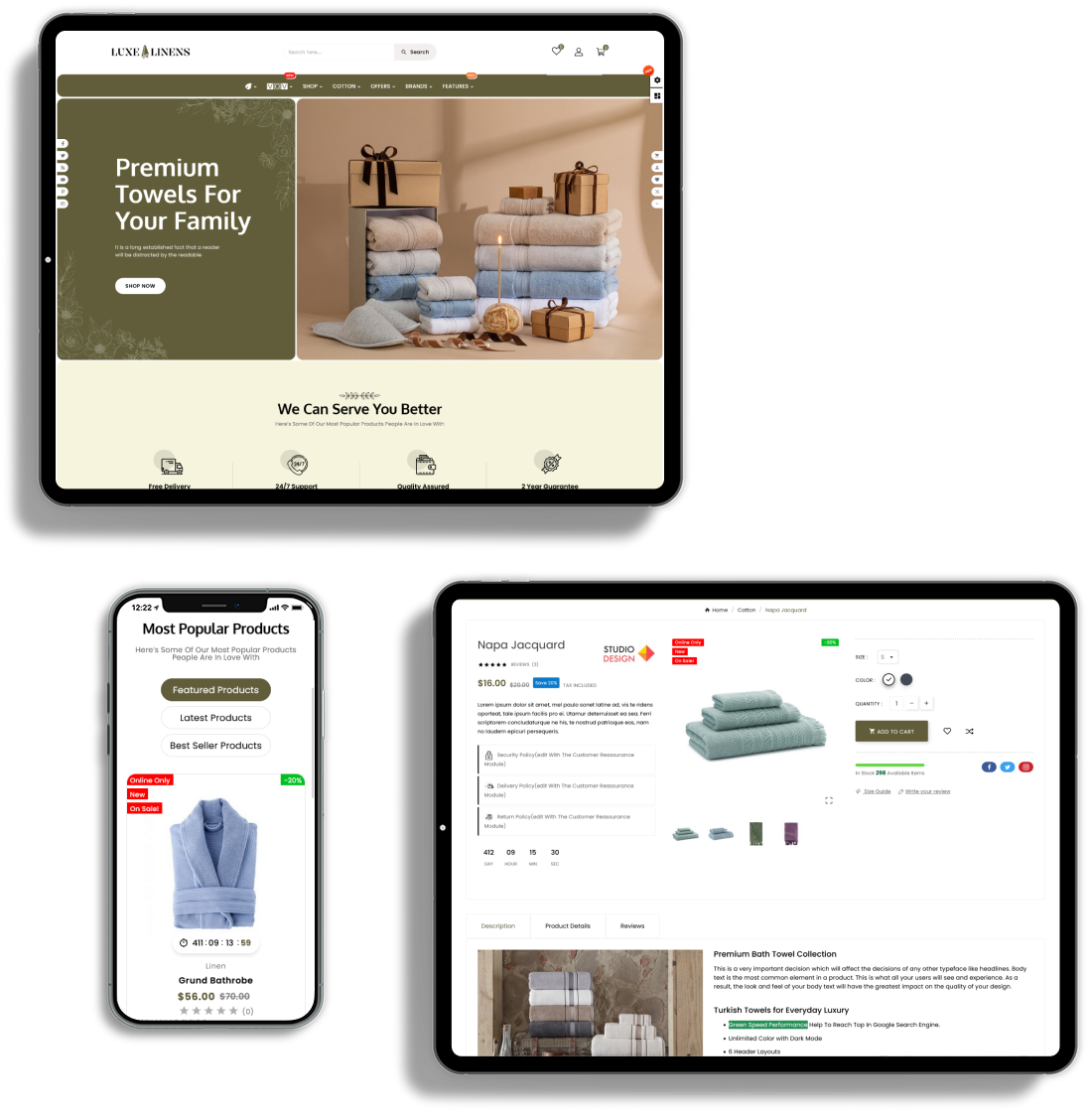 LUXELINENS is fully responsive, adapt the device size, pixel perfect and all elements look beautiful in all standard and Retina devices and resolutions.